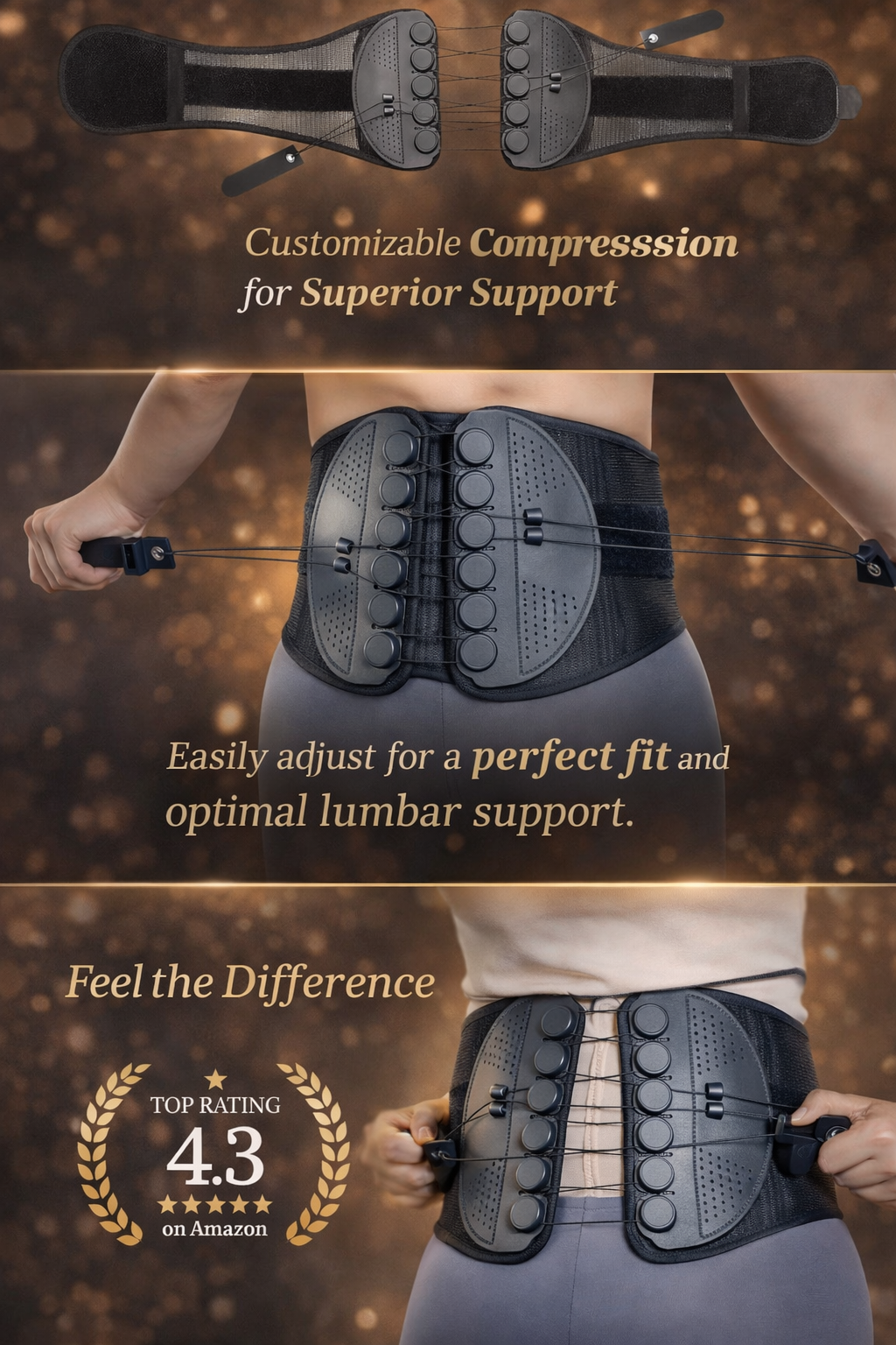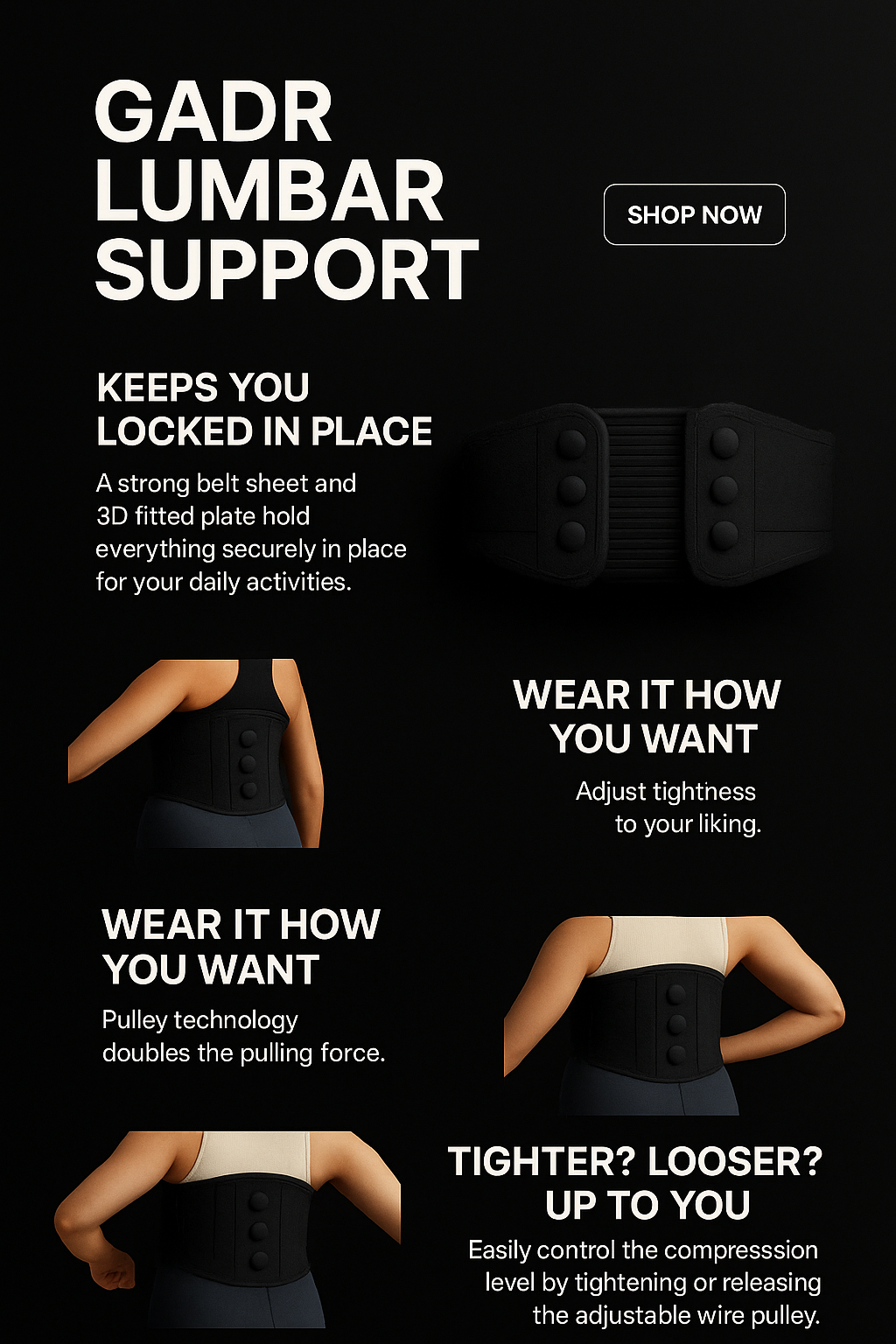 The GADR Lumbar Support belt uses a dual-layer sheet and a 3D fitted plate that mimic the natural curve of your spine. Combined with pulley technology, it provides adjustable compression and support, helping improve posture and reduce back strain.